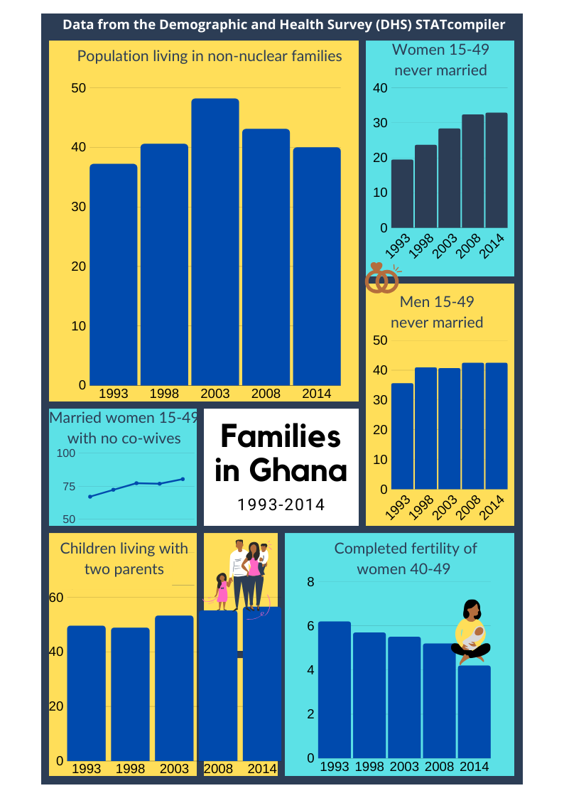 Families have become smaller over the period - decline in completed fertility (i.e. number of children born) and move towards living in traditional nuclear families. Nuptiality has also declined, a trend that is more pronounced for women.